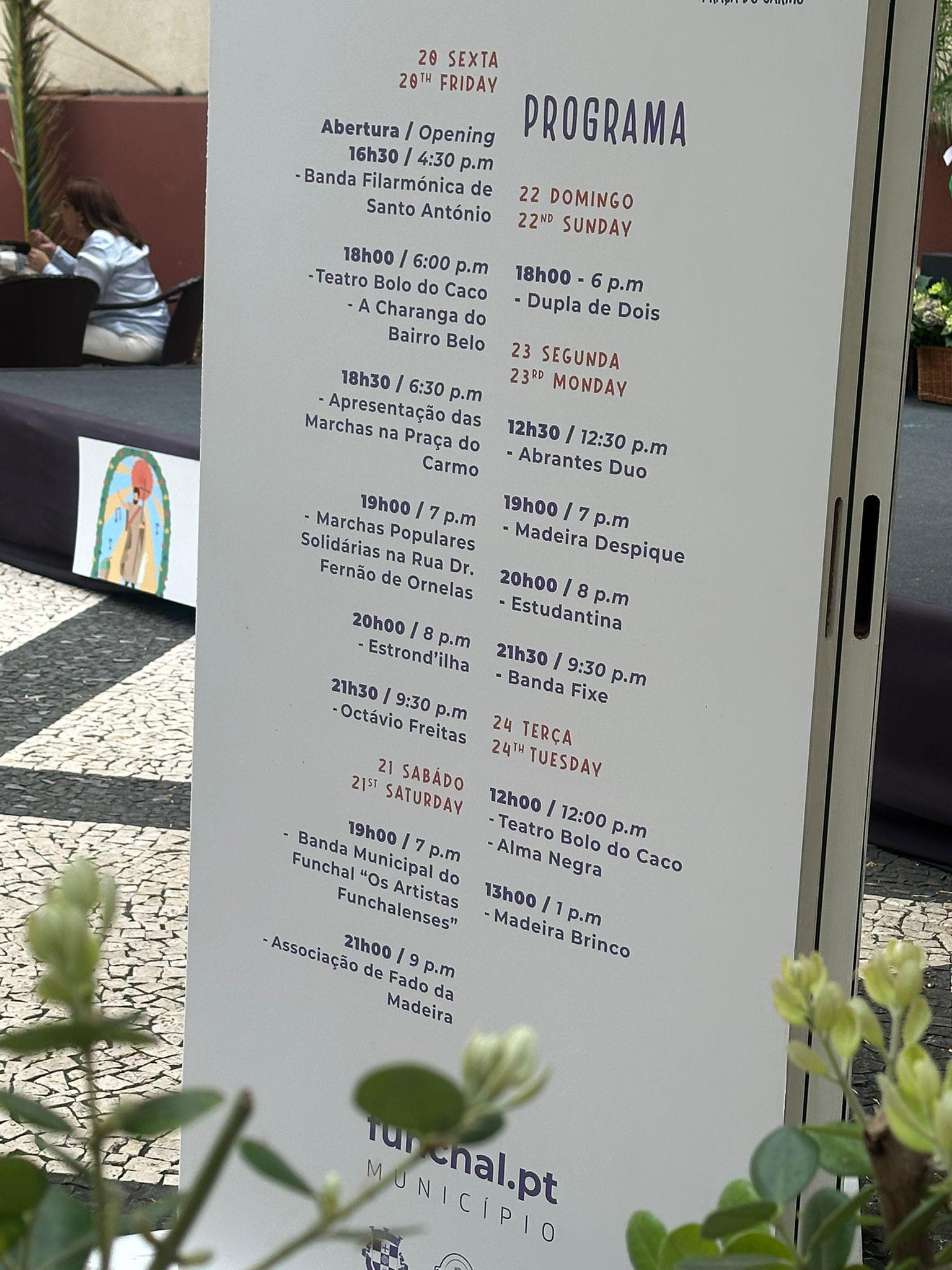 Durante cinco dias, a festa estende-se desde o Carmo até à Fernão de Ornelas, contando com a adesão de vários estabelecimentos comerciais da baixa funchalense, muitos dos quais irão preparar os seus próprios altares, recuperando uma das tradições emblemáticas da época. Não faltarão atuações da parte de diversos grupos regionais.