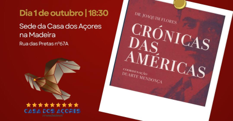 Na próxima quarta-feira, 1 de outubro, pelas 18h30 horas, decorrerá na Casa dos Açores na Madeira, na Rua das Pretas, Funchal. uma palestra realizada pelo investigador Duarte Mendonça baseada no livro ‘Crónicas das Américas’, da autoria do médico terceirense Joaquim Bartolomeu Flores