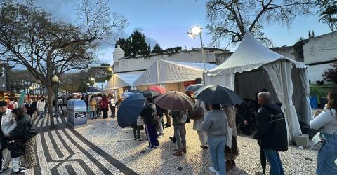 Chuva não afasta as dezenas de leitores que aguardam por um autógrafo e dois dedos de conversa com Pedro Chagas Freitas, na Feira do Livro, a decorrer na Avenida Arriaga.