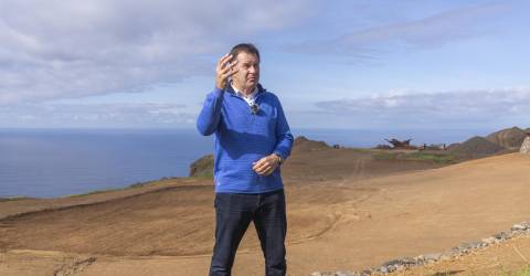 Sir Nick Faldo foi filmado a dar uma tacada naquele que será o buraco 8 do campo de golde da Ponta do Pargo fazendo a bola ‘voar’ sobre uma ravina. Dirigindo-se a Bryson diz que ele perto de casa não tem nada disto.