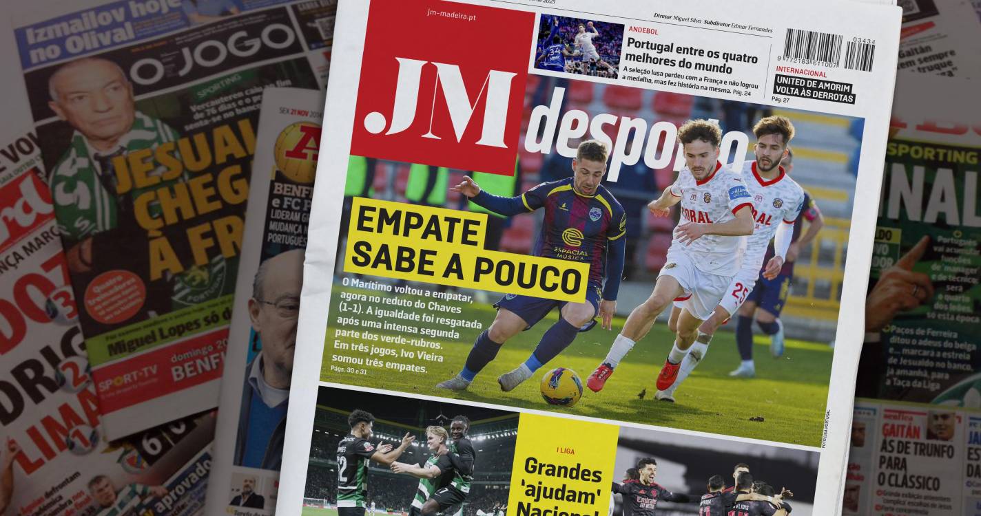 O empate do Marítimo na ‘casa’ do Chaves é o principal destaque na capa do JM Desporto. Em três jogos, o treinador Ivo Vieira somou três empates, acumulando, assim, três pontos.