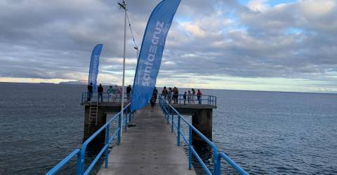 A nadadora de águas abertas, que partiu às 00h00 de hoje desde o cais de Santa Cruz para ser a primeira a nadar entre a Madeira e as Desertas, tem vindo a enfrentar uma ondulação mais agitada do que o previsto, pelo que a hora da chegada foi adiada por mais alguns minutos.