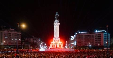Depois da comemoração no Estádio da Luz, em Lisboa, onde o Benfica confirmou a conquista do título ao vencer o lanterna-vermelha Santa Clara, por 3-0, em jogo da 34.ª e última jornada da I Liga portuguesa, milhares de pessoas confluíram para o Marquês de Pombal.