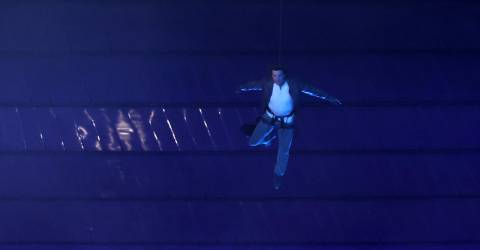 De repente, vindo dos céus, um viajante dourado aterra no centro do Stade de France, acompanhado por um jogo de luzes claro e escuro, num regresso ao início da humanidade.