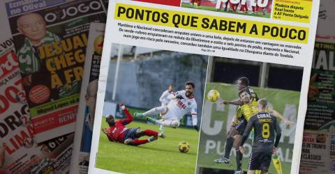 Marítimo e Nacional concederam empates ontem a uma bola, depois de estarem em vantagem no marcador. Os verde-rubros empataram no reduto da Oliveirense e estão a seis pontos do pódio, enquanto o Nacional, num jogo em risco pelo nevoeiro, concedeu também uma igualdade na Choupana diante do Tondela. Este é o tema que faz a manchete do suplemento desportivo do JM.