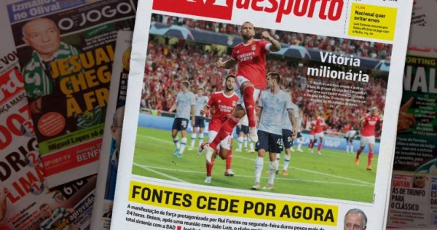 A Capa Desportiva do seu Jornal destaca ainda a vitória milionária do Benfica, que carimbou ontem o acesso à fase de grupos da Liga dos Campeões com uma expressiva vitória (3-0) sobre o Dínamo de kiev. O triunfo representa um encaixe de 38 milhões de euros.