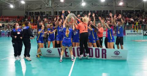 Numa explosão de alegria, as atletas e equipa técnica do Madeira SAD festejaram efusivamente a conquista da Supertaça, esta tarde, no Funchal., frente à formação do Benfica.