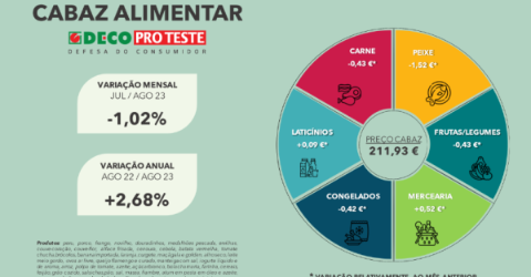A DECO Proteste dá conta que o cabaz alimentar, por si monitorizado, em agosto sofreu uma redução de 1,02% face ao mês anterior, contudo custa mais 2,68% relativamente ao mês homólogo de 2022.