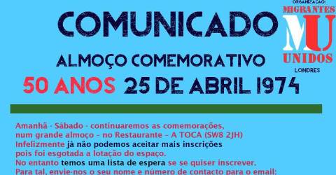 Alegria e emoção marcaram um tradicional almoço de opositores antifascistas em Londres, que teve hoje uma participação recorde ao juntar várias gerações para comemorar o 50.º aniversário da revolução de 25 de Abril de 1974.