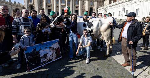 Agricultores italianos, que há vários dias protestam contra as políticas europeias para aliviar as alterações climáticas, entregaram hoje um trator ao Papa Francisco e levaram ao Vaticano uma vaca, que se tornou num símbolo das suas mobilizações.
