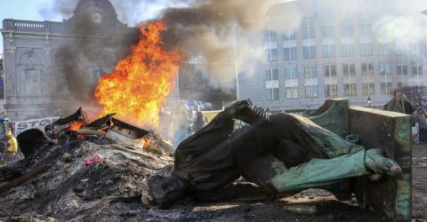A polícia belga utilizou mangueiras do cordão de segurança montado pela polícia de choque para tentar apagar os fogos que estavam mais próximos, mas a fogueira no centro da praça com a estátua derrubada, pedaços de cartão e ferro ainda estavam a arder até depois do meio-dia (11:00 em Lisboa), segundo a agência noticiosa espanhola EFE, causando uma nuvem constante de fumo negro que dominou o protesto.