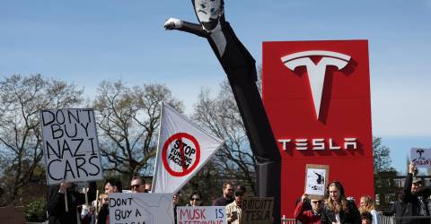 Em Londres, dezenas de pessoas reuniram-se em torno do edifício da Tesla, na zona de Park Royal, no noroeste da cidade, onde empunharam cartazes com mensagens como “A Tesla financia fascistas”, “Musk está a destruir a democracia” e “Buzina se odeias o Elon”.