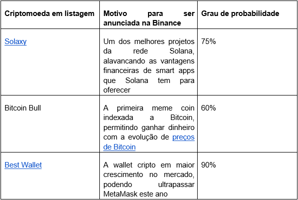 Porém, e como faz sentido apostar nestes projetos numa fase inicial, é na pré-venda e nas novas listagens que encontramos as melhores oportunidades. Fizemos uma investigação de o que pode ser o top de Binance nova listagem para as próximas semanas: