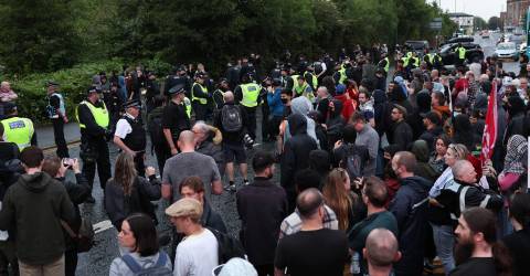 Imagens transmitidas em direto pelo canal britânico Sky News mostraram um clima tenso de confronto entre manifestantes de extrema-direita e de fações contrárias, separados por agentes da polícia de ambos os lados de uma estrada.