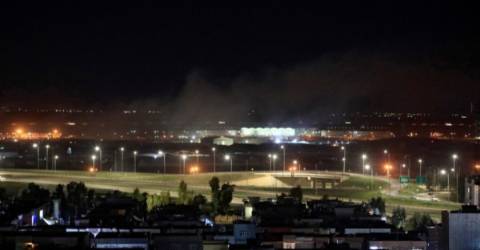 Pelo menos um projétil atingiu o complexo militar onde estão estacionadas forças da coligação liderada pelos Estados Unidos junto ao aeroporto internacional da cidade, numa região do norte do país dirigida pelos curdos iraquianos, indicou um responsável à agência noticiosa AFP.