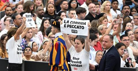 As jovens, que vestiam ‘t-shirts’ e exibiam cartazes onde se lia, em italiano e inglês “As touradas são pecado”, terão saído do corredor central da sala Paulo VI, no Vaticano, a gritar, descreve a agência noticiosa EFE.