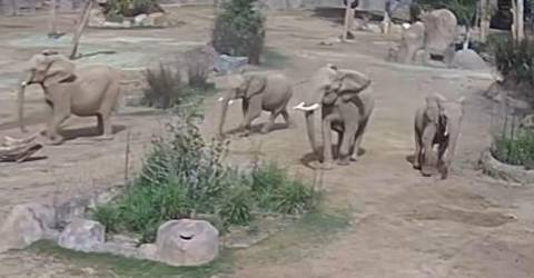 Mais tarde, no momento do tremor, os animais mais velhos (Ndlula, Umnganiy e Khosi) são vistos a correr para cercar e proteger os dois jovens de 7 anos (Zuli e Mkhaya) de qualquer possível perigo causado pelo sismo, que ocorreu no condado de San Diego, no Estado norte-americana da Califórnia, pouco depois das 10:08 (18:08 em Lisboa), de segunda-feira.