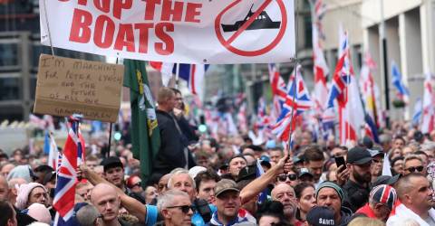 Na multidão podiam ver-se cartazes a pedir para que os políticos “parem os barcos” de migrantes que atravessam o Canal da Mancha e para “trazer de volta o Ruanda”, uma referência à política de deportação de requerentes de asilo para o país africano.