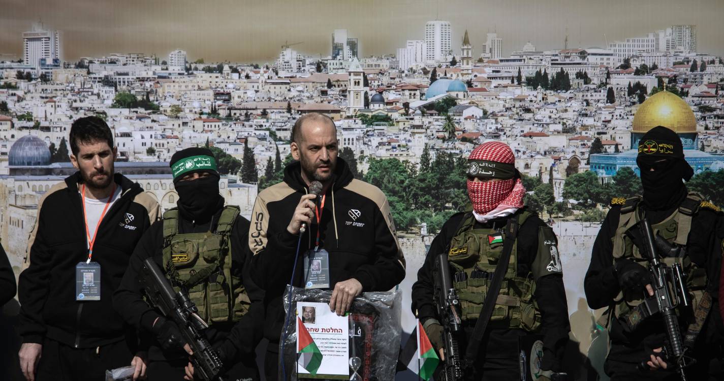 Antes de serem entregues à Cruz Vermelha Internacional e transferidos pelo Exército para Israel, os três homens subiram a um palco, cercados por combatentes do Hamas e da Jihad Islâmica, um movimento palestiniano aliado.