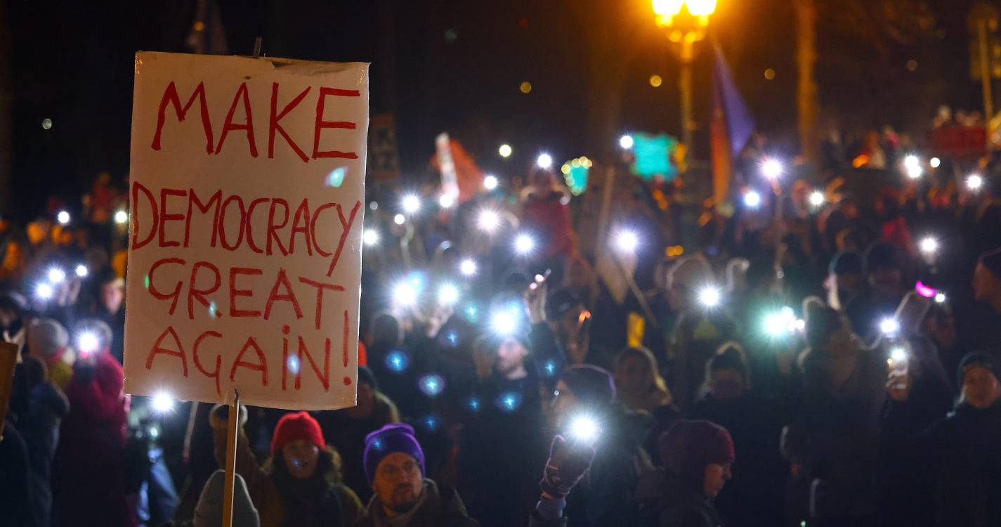 “Shame on you CDU” (Que vergonha, CDU) ou “Merz sem coração” (em referência ao líder da CDU, Friedrich Merz), são palavras de ordem escritas em cartazes empunhados pelos manifestantes, na contestação à decisão desta semana dos conservadores democratas-cristãos de se aliarem no partido de extrema-direita AfD com o objetivo de tentar passar no parlamento um diploma para limitar a imigração.