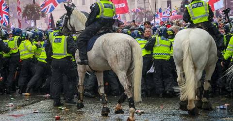 “Os agentes foram obrigados a intervir em vários pontos para impedir que os manifestantes da ‘Unir o Reino’ rompessem os cordões policiais ou se aproximassem dos grupos da oposição. Vários agentes foram agredidos”, informou a Polícia Metropolitana (Met) na sua conta no X, acrescentando que quando os agentes intervieram “enfrentaram uma violência inaceitável”.
