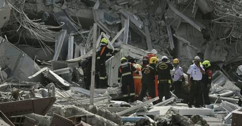 Dois terramotos, de magnitude 7.7 e 6.4, ocorridos esta sexta-feira, provocaram o colapso de um edifício em construção em Banguecoque, na Tailândia. A polícia local já iniciou buscas para detetar 43 trabalhadores que estariam no edifício aquando do abalo e que poderão estar soterrados nos escombros.