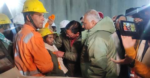 Quando o primeiro trabalhador foi retirado, Pushkar Singh Dhami, o mais alto funcionário eleito do Estado de Uttarakhand, ofereceu-lhe uma grinalda e pendurou-a ao pescoço, enquanto os socorristas, funcionários e familiares aplaudiam.