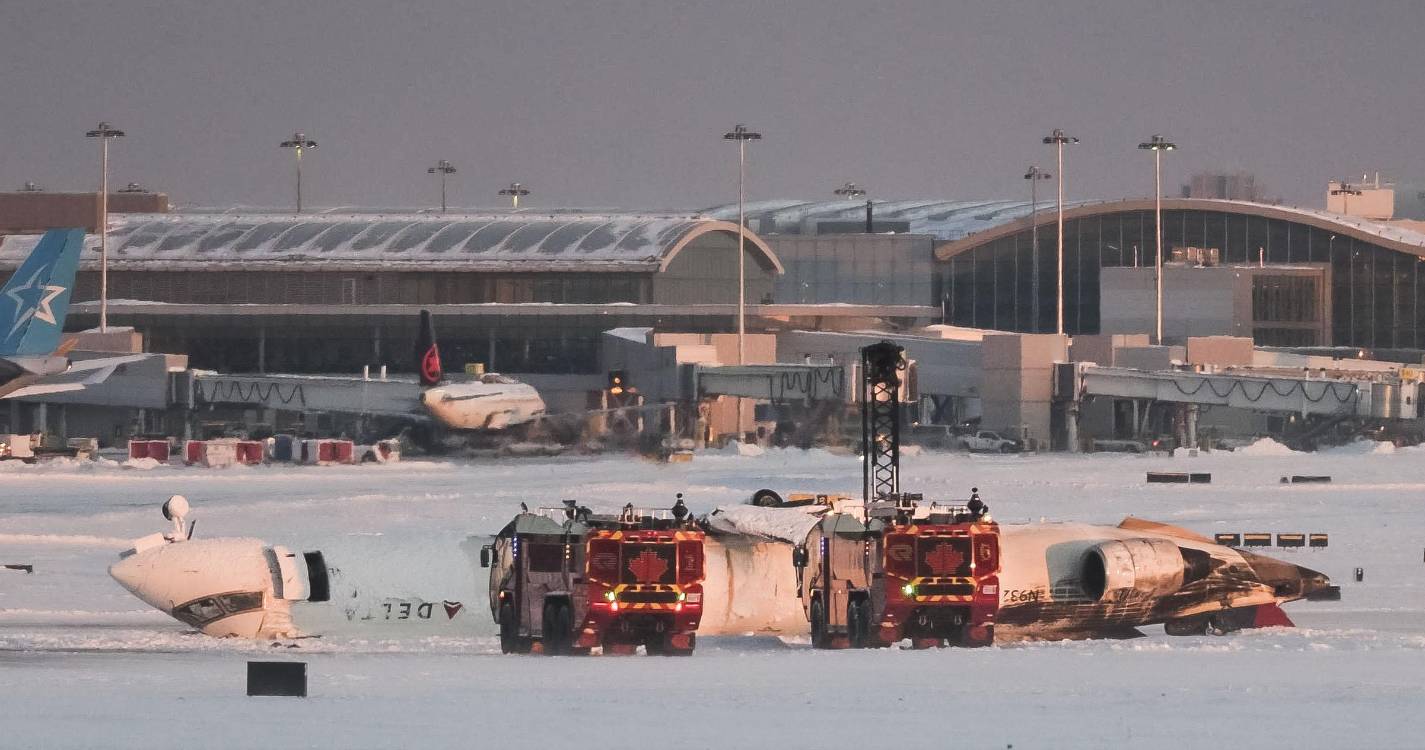 Ontem, um avião da Delta Air Lines sofreu um acidente no Aeroporto Internacional Pearson, em Toronto, no Canadá, quando estava a aterrar, tendo ficado virado ao contrário.