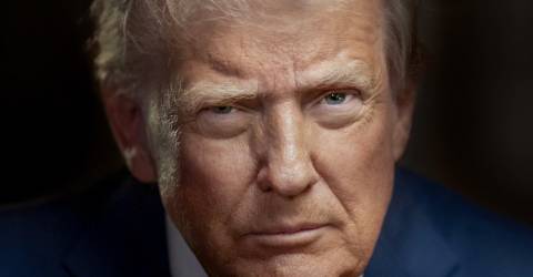 Todos se prostram perante Trump, cujo rosto aparece no corpo de um leão.
