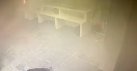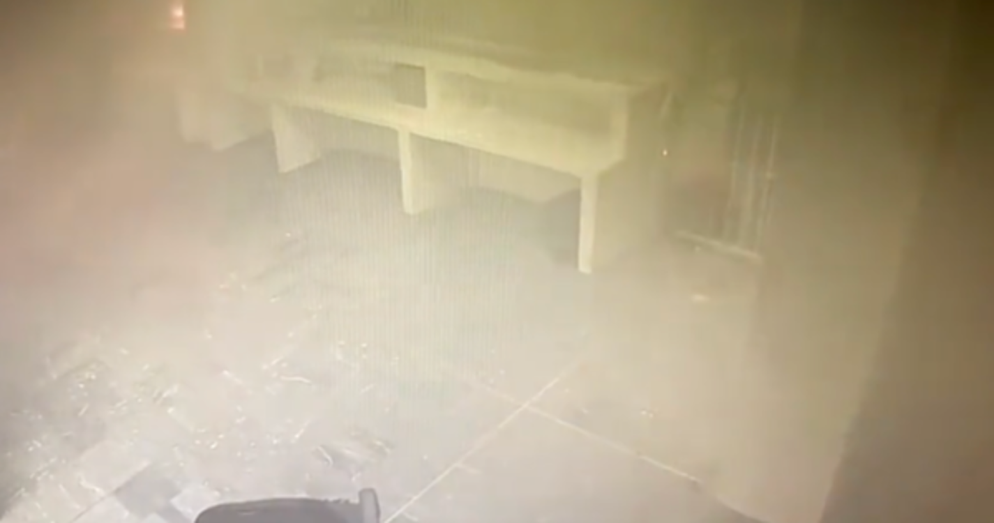 Na imagem, veem-se duas pessoas vestidas com o uniforme dos guardas a correr. Pelo menos um migrante aparece do outro lado das grades metálicas. Não é percetível qualquer tentativa para libertar os homens e, enquanto nuvens de fumo enchem o espaço em segundos, os guardas fogem do local.