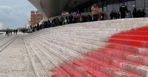 Um grupo de apoiantes do movimento Climáximo escreveu hoje a frase “Fechar centrais de gás” na ponte do museu MAAT e atirou tinta vermelha contra a sede da EDP, em Lisboa.