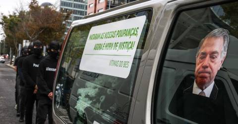 Representantes dos lesados do Banco Espírito Santo estão hoje em protesto junto ao Campus de Justiça, em Lisboa, com um carro funerário onde colocaram uma fotografia de Ricardo Salgado, no dia do início do julgamento do caso BES.