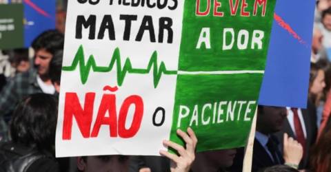 "Eutanásia, genocídio legal", lia-se em letras pintadas a preto e vermelho numa faixa segurada por dois dos vários jovens, alguns dos quais ainda vestidos com a farda do colégio, que se juntaram à manifestação promovida pela Federação pela Vida.