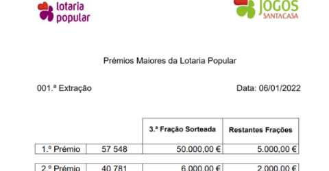 O Departamento de Jogos da Santa Casa da Misericórdia anunciou hoje a lista oficial de prémios referente à 1ª Extração da Lotaria Popular de 2022.