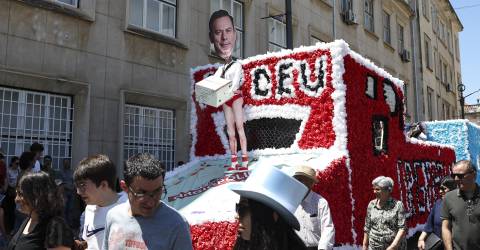 Cerca de uma centena de carros desfilam hoje no cortejo da Queima das Fitas de Coimbra, alguns com mensagens políticas, apesar do clima de festa que se sente pelas ruas da cidade, com milhares de pessoas a assistir.