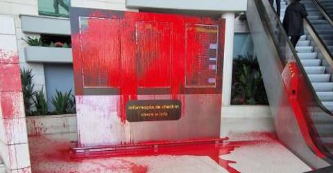 O aeroporto Humberto Delgado foi, esta manhã, manchado com tinta vermelha, por manifestantes.