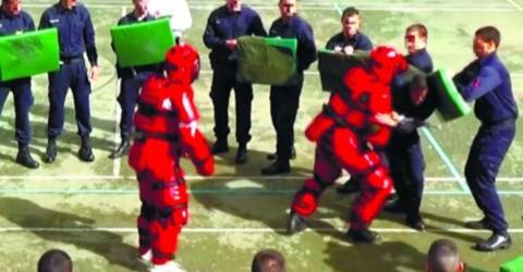 No exercício em causa, o instrutor aparece protegido com capacete, luvas, chumaços e caneleiras de cor vermelha e enfrenta os instruendos que têm um bastão de plástico revestido a esponja e borracha, para treinarem o uso do bastão extensível em defesa contra eventuais perigos de rua ou agressões.