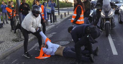 Os ativistas estiveram sentados no asfalto durante cerca de 20 minutos, até aparecerem três agentes da PSP que os retiraram da estrada, constatou a agência Lusa no local.