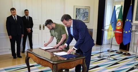 Portugal e Ucrânia, “com outros parceiros”, comprometem-se a trabalhar em conjunto “para assegurar que as forças de segurança e defesa da Ucrânia são capazes de restaurar a integridade territorial da Ucrânia dentro das suas fronteiras internacionalmente reconhecidas desde 1991, bem como para contribuir para a sua modernização, de modo a incrementar a sua capacidade de responder a qualquer possível agressão armada e a sua interoperabilidade com as forças da NATO”, acrescenta-se.