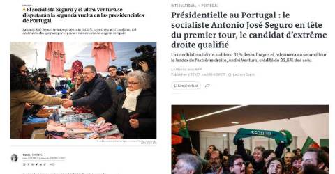 Num artigo com o título “O socialista Seguro e o radical Ventura disputarão a segunda ronda das Presidenciais em Portugal”, o espanhol El País sublinha a forma como António José Seguro, “retirado da política nos últimos dez anos” e “sem grande apoio inicial no seu próprio partido”, ficou em primeiro lugar “contra todos os prognósticos e quase contra todos”, marcando um confronto na segunda volta, em 08 de fevereiro, com “o candidato da direita radical, André Ventura”.