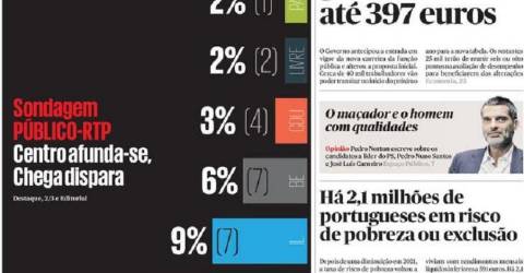 Merece relevo o resultado do Chega, que subiu de 10% para os 16%. O IL regista 9 nesta sondagem, o BE 6% e a CDU 3%. Já o Livre, o PAN e o CDS ficam-se pelos 2%