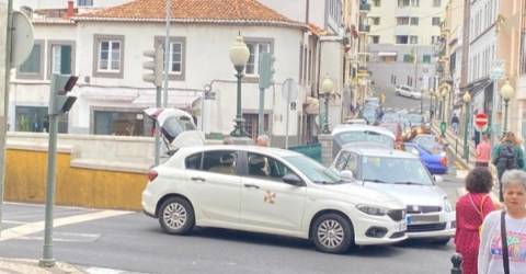 Dois veículos ligeiros acabam de colidir no cruzamento entre a Ponte Nova e a Rua 5 de Outubro.