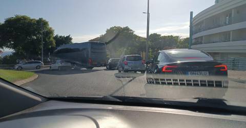 Um ligeiro e um autocarro de turismo colidiram esta tarde na rotunda da Assicom, junto à estátua do anjo.