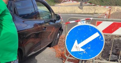 Um veículo ligeiro ficou com o pneu preso num buraco, devido a umas obras que estão a ser realizadas, no fim da Estrada José Avelino Pinto, no Caniço de Baixo.