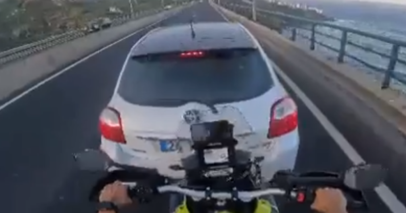 Nas imagens gravadas é possível ver um motociclo a colidir contra a viatura em questão, após o condutor do veículo ter reduzido a marcha propostitadamente ao ponto deste ficar parado na ponte do Porto Novo.