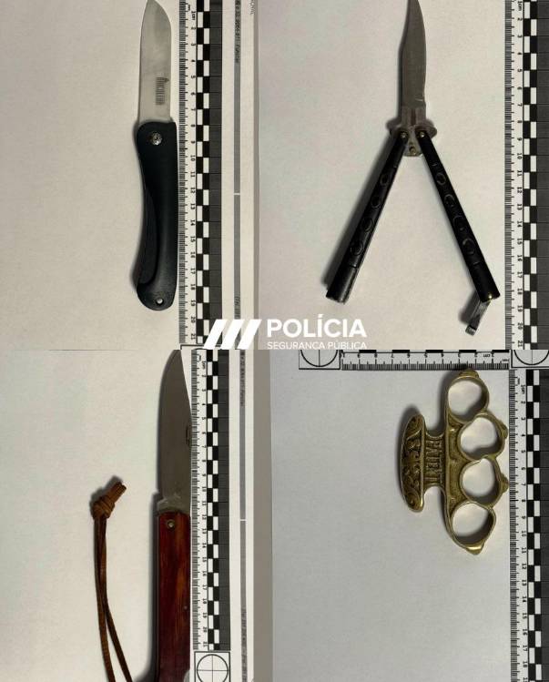 As suspeitas foram confirmadas após revista aos envolvidos, tendo sido apreendidas duas armas brancas, duas armas proibidas e quadro doses te ecstasy e uma de bloom.