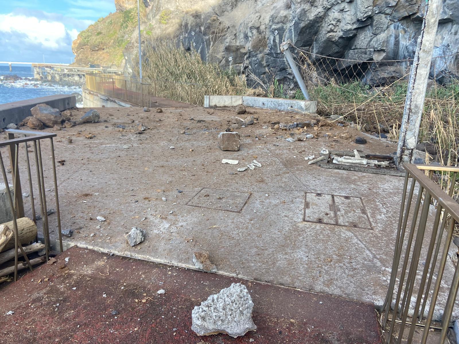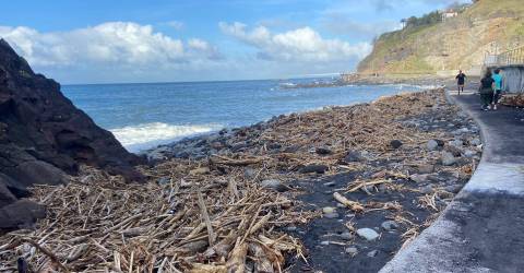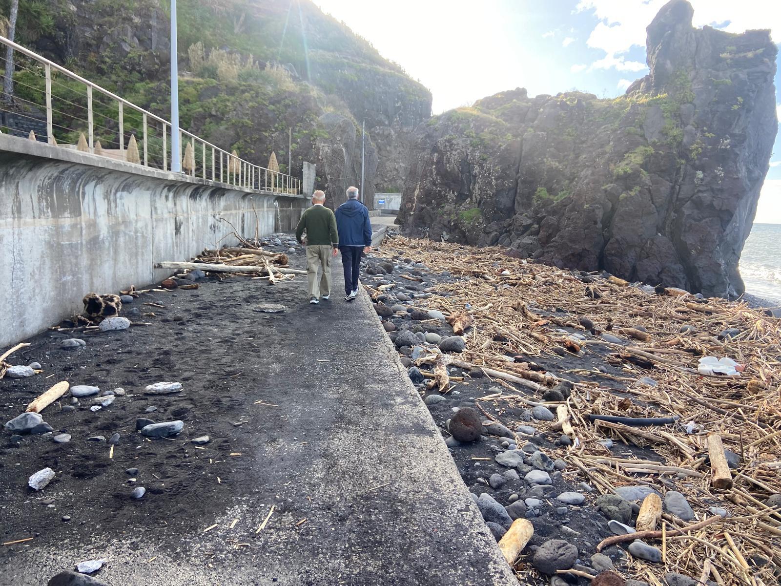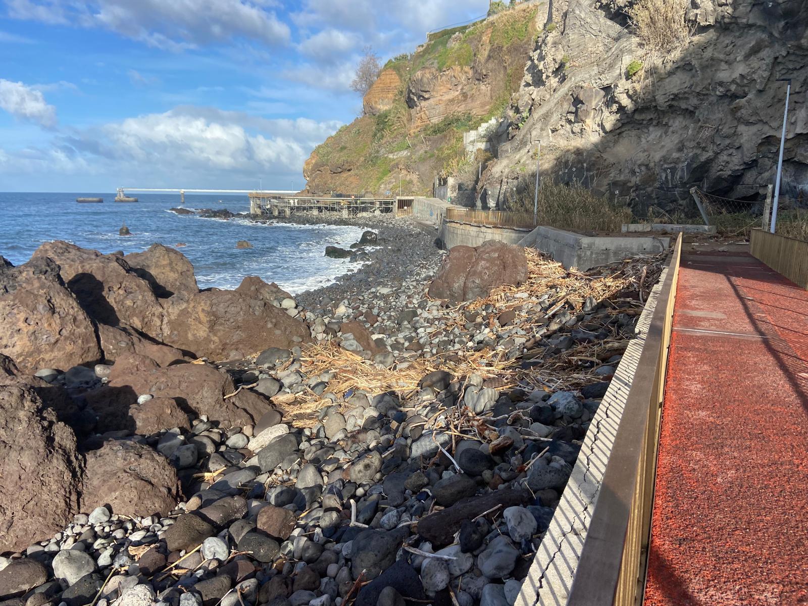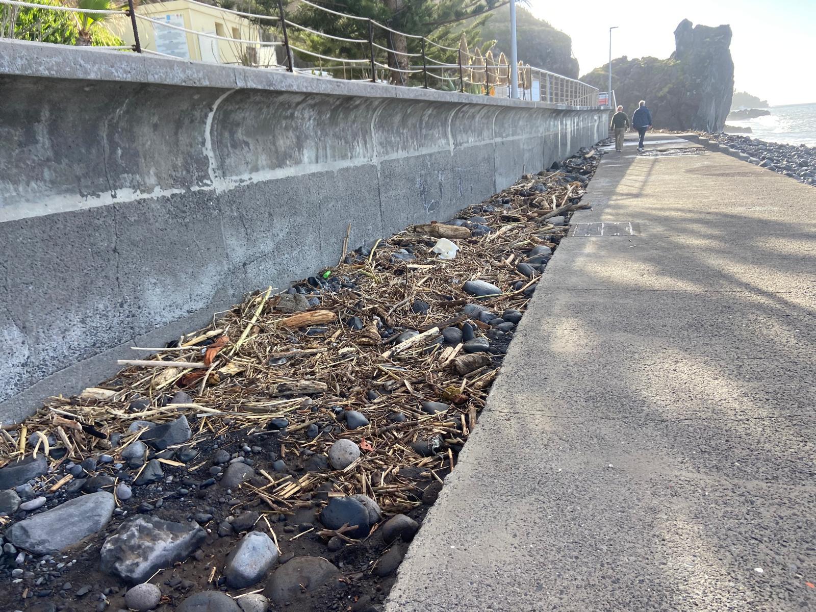 Na praia de calhau são visíveis paus e canas que as águas levaram para o mar e que a forte ondulação devolveu para a praia. De igual forma, várias pedras foram arrastadas até ao passeio e outras também se desprenderam da encosta.