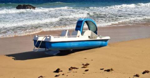A pequena embarcação foi sendo arrastada pela ondulação para terra, até ficar presa no areal da ilha dourada, conforme relatam testemunhas oculares.