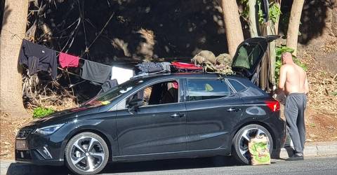 Nas imagens enviadas ao JM é possível observar o carro estacionado na rotunda e várias peças de roupa penduradas num fio colocado entre duas árvores. Entre os objetos encontram-se ainda sacos-cama e material associado a caminhadas.