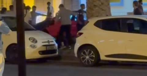 Nas imagens é possível observar várias pessoas envolvidas numa briga, tendo aparentemente uma delas ficado prostrada no chão e sido pontapeada.